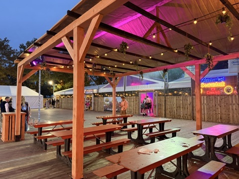 Das Fest fand direkt an einer großen Sportanlage statt. Der gesamte Boden war mit modernen Holzplatten ausgelegt, sodass man trockenen Fußes durch das Gelände gehen konnte. Im Außenbereich befand sich ein gemütlicher Biergarten mit zahlreichen Tischen und Bänken, wo man den Abend im Freien genießen konnte.