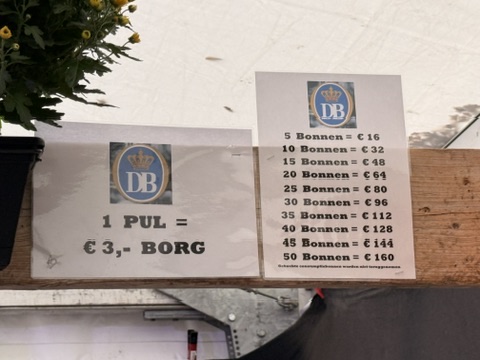 Bezahlt wurde mit sogenannten Bonnen (Wertmarken). Diese Bonnen bildeten die Währung des Oktoberfests: 5 Bonnen kosteten 16 €, 50 Bonnen 160 €. Jeder Gast erhielt beim ersten Getränk einen Krug, den man später einfach gegen einen neuen eintauschen konnte (3€ Pfand). Ein halber Liter Bier kostete acht Euro, Cola und andere Getränke waren ebenfalls erhältlich.